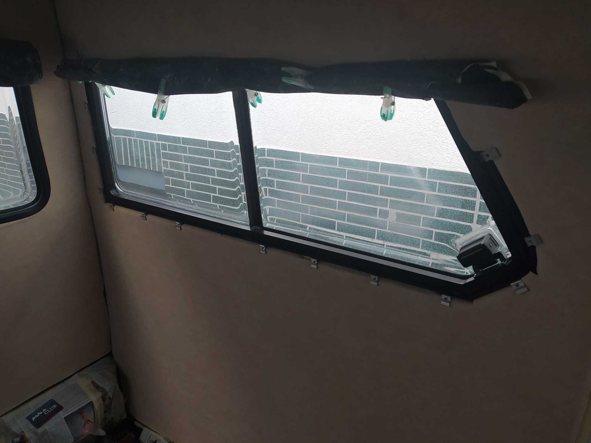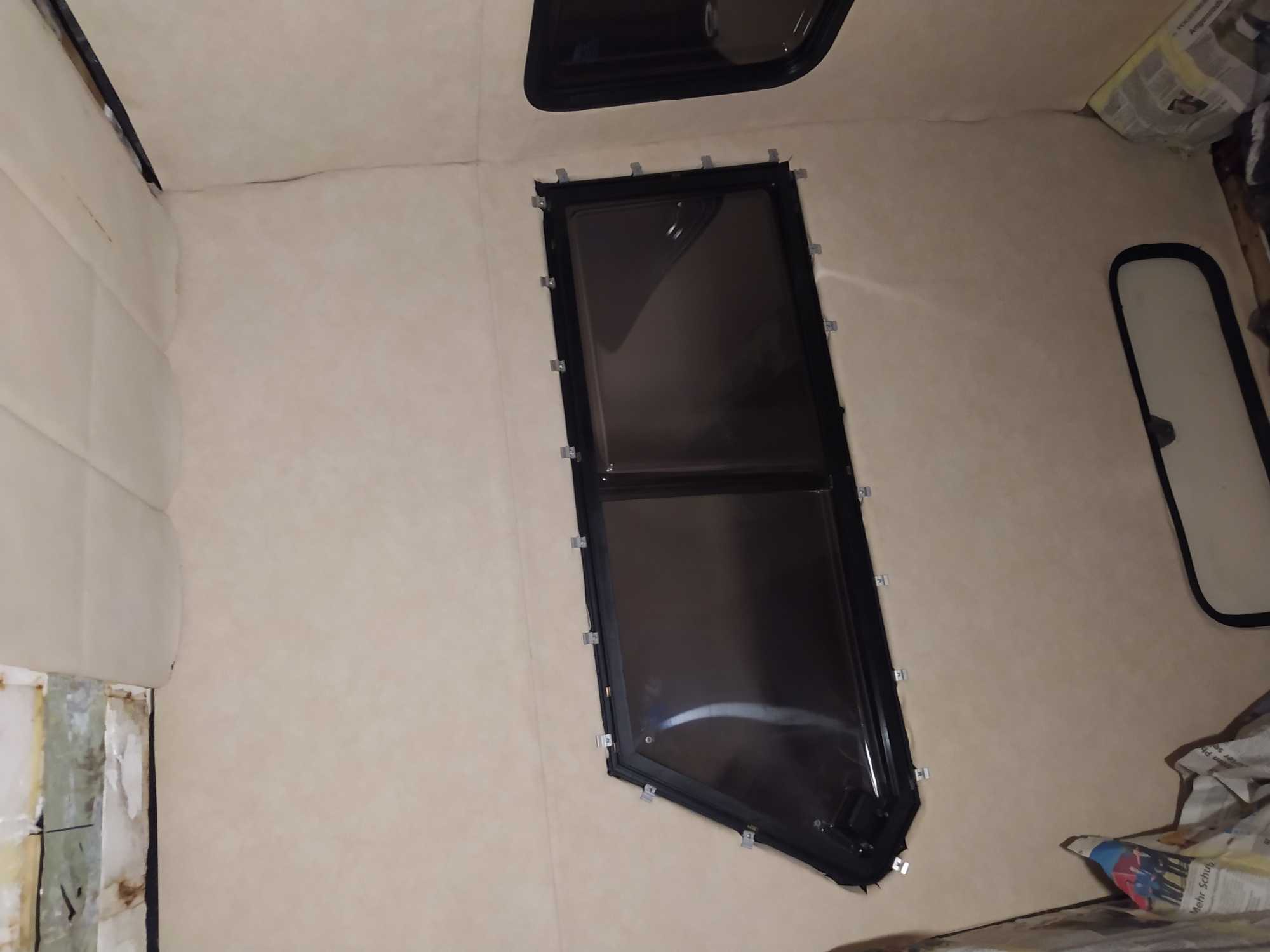 Das Dachfenster über dem Heckbett, die beiden Seitenfenster und das Heckfenster (bis auf die äußere Rundschnur ;0) ) sind wieder drin.