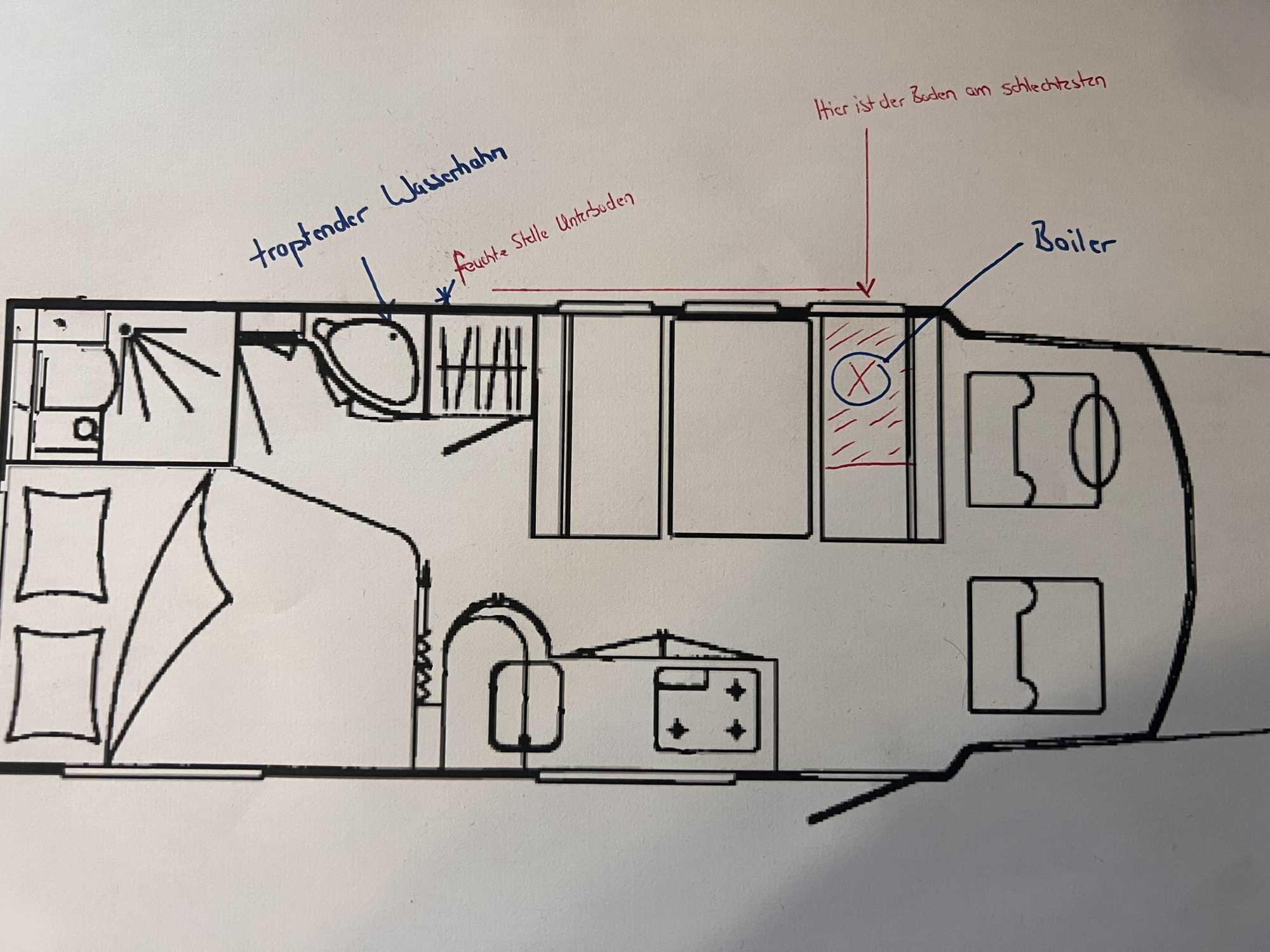 Das letzte Foto sollte eigentlich nur den Schimmel an der Wand zeigen, dort ist das Wasser nach unten getropft --> unter dem schwarzen Kasten ist das linke Hinterrad, daran ist es dann nach unten gelaufen und hat sich dort dann gesammelt und dann seinen Weg nach vorne ( Richtung Boiler ) gebahnt.