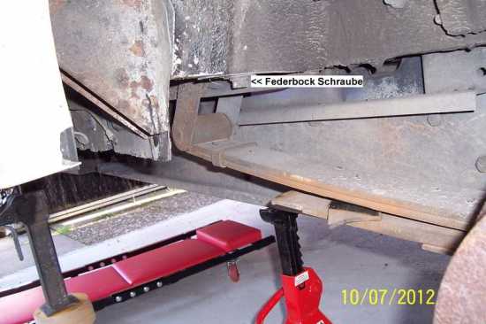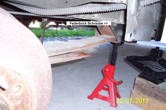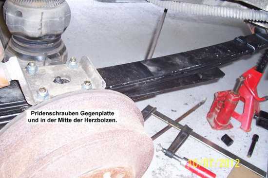 Da man nicht an die Mutter der Schwinge heran kommt, ist es einfacher, den Schwingenbock und den Federbock insgesamt abzuschrauben. Dabei sind jeweils die 4 Schrauben zu entfernen. Unter der Achse wird ein Wagenheber angesetzt, jetzt können die Pridenschrauben gelöst werden. Nach Absetzen mit dem Wagenheber kann das Federpaket heraus genommen werden.
