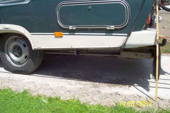 Alle Schrauben mit viel "Schmackes" wieder angezogen. Rad montiert und Womo auf eigene Füße gestellt. Natürlich erstmals wieder auf den Keil, um für die andere Seite die gleichen Bedingungen zu haben.
