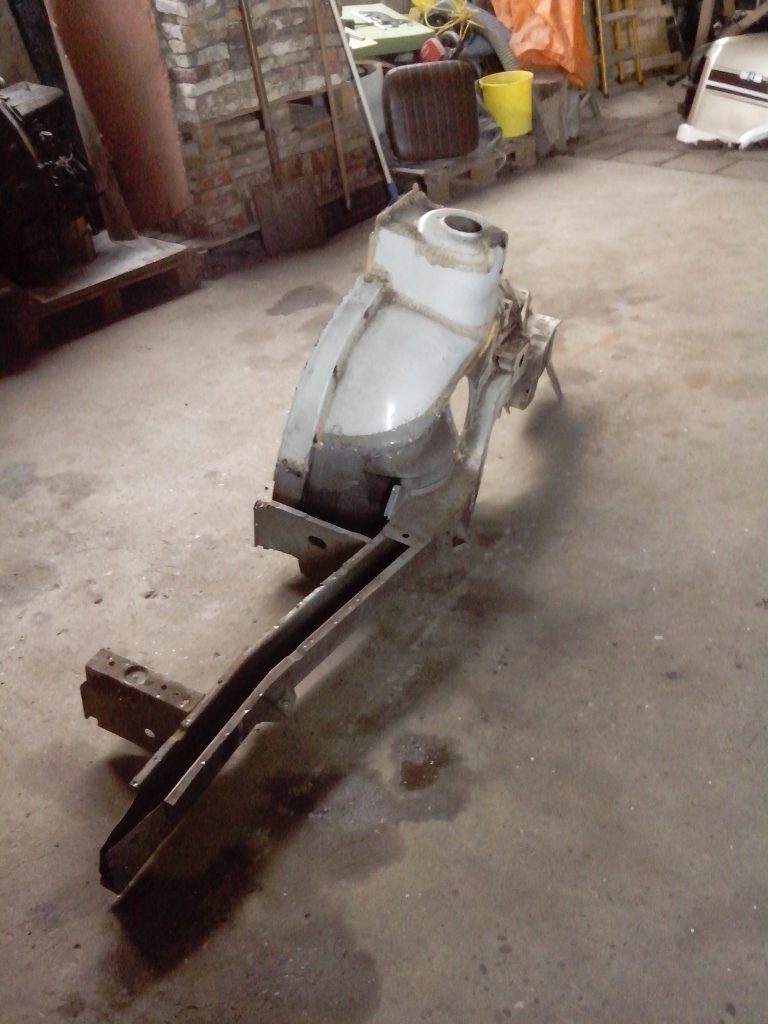 und das vordere endstuck. Auch hinter der getriebeträger war ein schlechtes stuck, und da ich das komplette teil vor einbau nach alle seiten umdrehen konnte, habe ich das erstens getan. Hierfür habe ich die getriebeträger und die luftfilterträger entwiedert und nachher wieder angeschweitzt.
