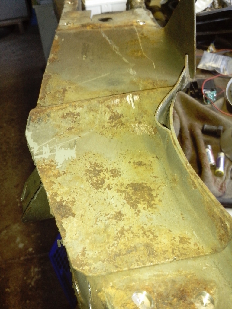 Querdurchsnit von die langsträger gleich vor die zweite querträger, es ist gut zu sehen das nur die unterseite noch fest war. Dies hätte mann repariert mit dünnes blech und dichtmassa.