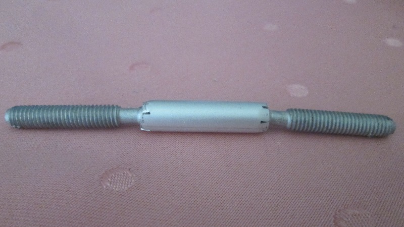 Dazu benutzte ich ein Alurohr mit 8 mm Außendurchmesser, das auf eine Länge von 30 mm zugesägt wurde. Zur Aufnahme der Kugelköpfe wurde das Rohr mehrmals an den Enden eingesägt, der Kugelkopf eingesetzt und das Rohr mit einer Zange zusammengepresst. Damit das Rohr nicht sich nicht verschieben kann, wurde innen eine Feder aus einem Kugelschreiber eingefügt, die ich vorher etwas gestreckt habe.
