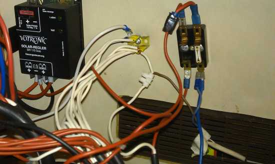 Ein sonderbarer Verteiler, der nur vom Solarregler gespeist wird. Eine der Leitungen (die mit Sicherung - blau dick) geht zu einer 12 V-Steckdose vor dem Bad. Das blau/braune Kabel scheint nach rechts rüber zu gehen, so geht sie jedenfalls hinter dem Fahrersitz Richtung Beifahrersitz. Das ist zunächst mein Job für morgen. Das Ende der anderen (ohne Sicherung)konnte ich noch nicht finden. Sie verschwindet bisher irgendwo unter dem Frischwassertank. Kann aber nicht so wichtig sein. Ich fand noch nicht heraus, was nicht funktioniert.
