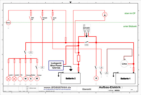 Trotzdem ganz ganz herzlichen Dank für den Entwurf. Sieht super aus. Auch ich habe mir die Verteilung oben/unten genau so vorgestellt. Mein Radio ist übrigens auch oben und bekommt seinen Strom auch von der Bordbatterie und vor dem Hauptschalter. So war's jedenfalls bisher und finde ich auch gut. Möglicherweise weniger komische Überraschungen mit der Starterbatterie.