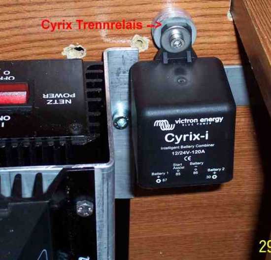Mit dem Cyrix gehts Du am besten auf den S1/11 (= +Batterie1) und S1/8 (= +Batterie2) an der Flachsteckerleiste, für die Du so einen tollen Halter gebaut hast. Masse natürlich auch. Ob Du die Notkoppelfunktion brauchst, musst Du selbner wissen. Bei woru habe ich sie eingebaut; bei schattenparker schon nicht mehr.
