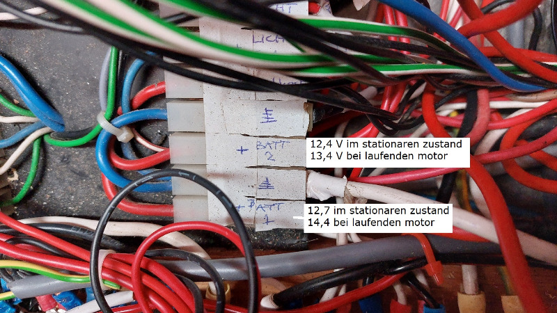 Die Haushaltsbatterien (2 x 160A) sind nicht ausreichend geladen, beim Messen der Spannung an den Kontakten des alten Ladeschranks sehe ich einen Spannungsabfall zwischen Batterie 1 und Batterie 2.