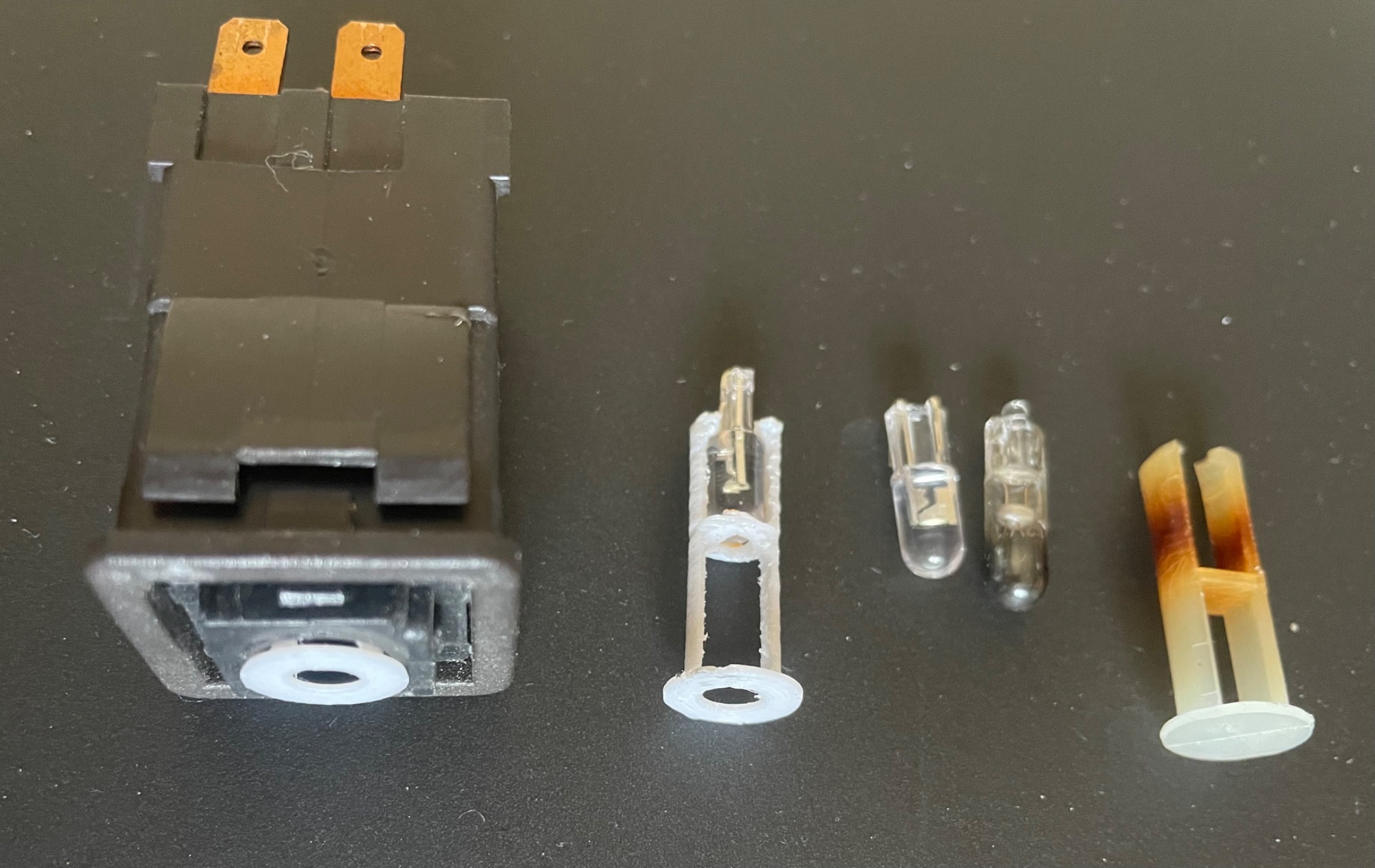 Wie vermutet haben die LED geringfügig andere Maße und passen deshalb nicht in die originalen Halter. Da ich kein transparentes Material zum Drucken zur Verfügung habe, wurden die neuen Halter mit Loch gedruckt, damit das Licht bis zum Schalter leuchtet.