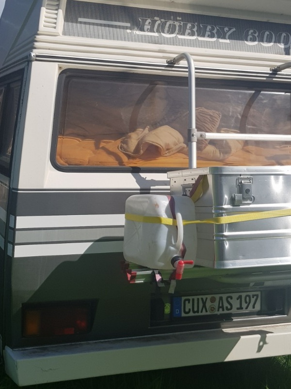 Wir haben einen 10l Kanister rechts neben dem Beifahrersitz mit einem Spannfix.