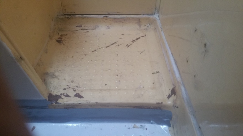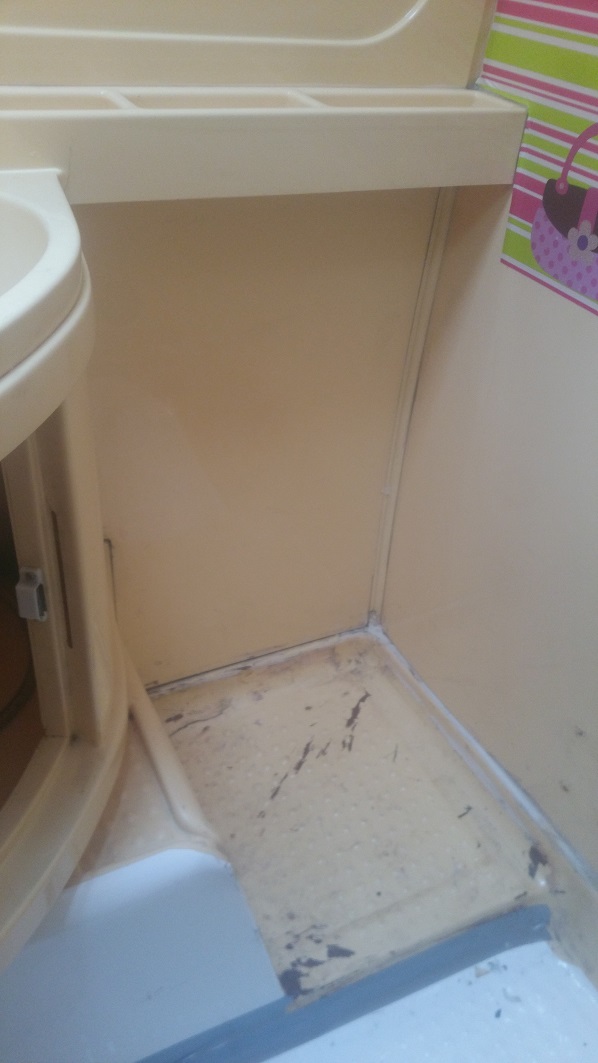 Also baue ich die auf den Absatz auf dem das PortaPotti stand. Auch der Rand dieses Absatzes ist gebrochen, das sah ich aber erst als ich die Klebestreifen dort abgezogen habe. Im linken Bereich ist alles weich und nicht standfest, daher habe ich dort weiter eingeschnitten und das Plastik der Wanne so weit angehoben bis ich das Holzbrett auf der rechten Seite gesehen habe.