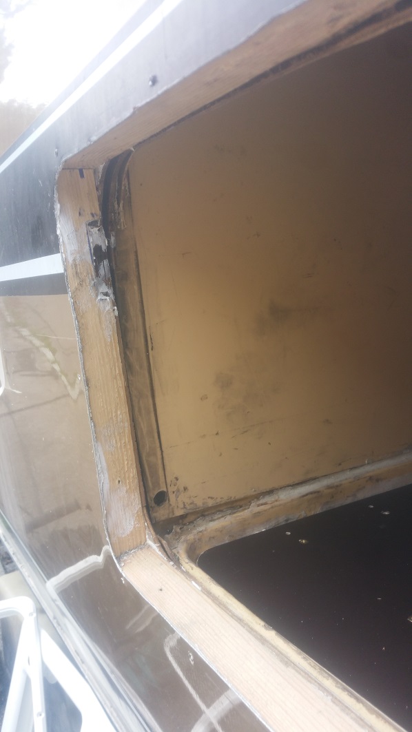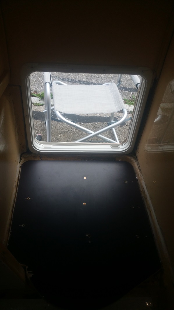 Von innen schaut mich die alte Verkleidung beleidigt mit einem cm-breiten häßlichen Spalt an. Der läßt sich auch mit Dekalin nicht ordentlich verstecken. Da hab ich versuchshalber mal den Außenrahmen der Serviceklappe rein gesetzt, der würde perfekt passen.