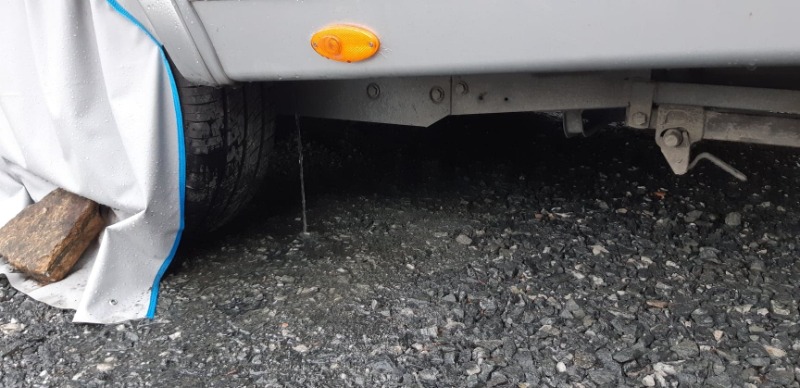 Zum Thema: Gerade (es giesst, Aussentemperatur 7 Grad, auf den Bergen hinter uns wieder Schnee) zum Hobby gucken, weil bald Urlaub. Mann im Hobby, ich draussen. Da sehe ich WASSER - hinten links unten ... es stroemt heraus, aus einem Schlauch, gleich hinter dem Hinterrad.