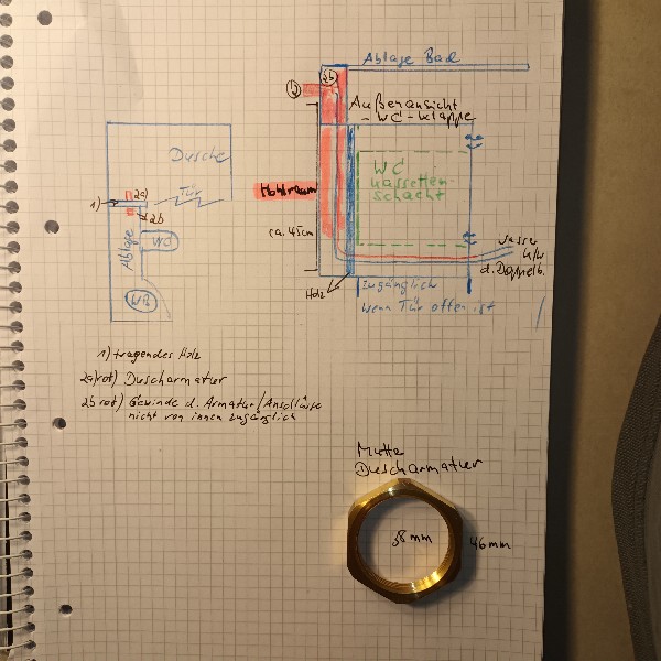 Ich konnte ich feststellen, ob die Leitungen, die in der WC-Klappe sichtbar sind zuerst zum Waschbecken laufen und es dort nochmals einen Abzweig Richtung Dusche gibt.