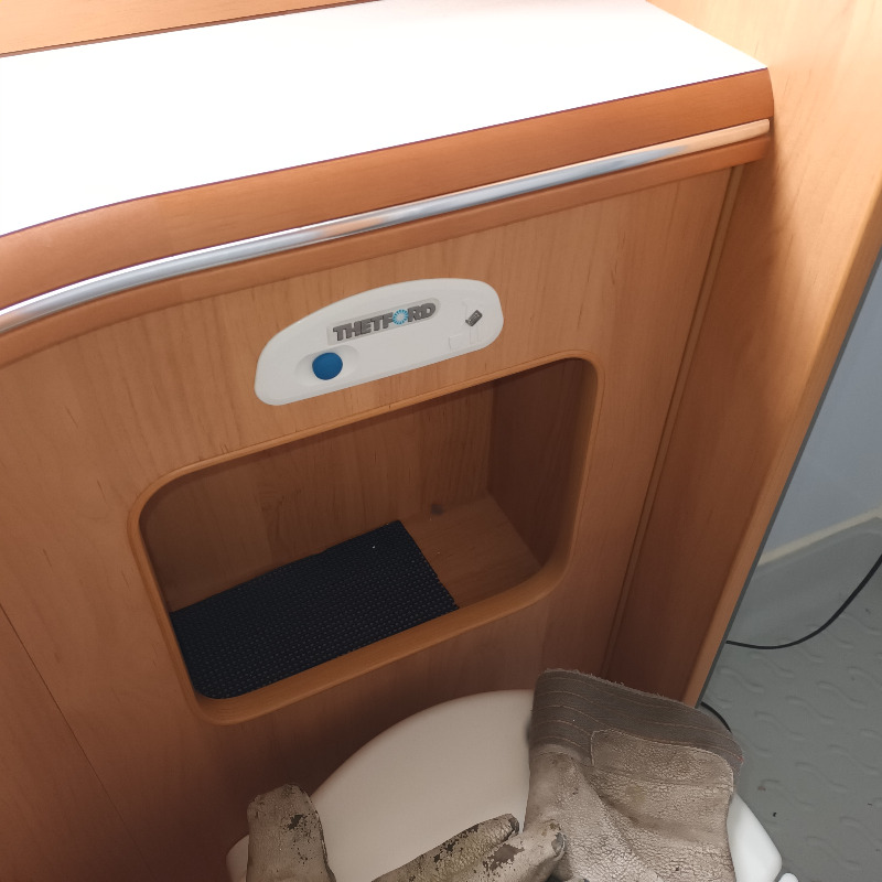 Liebe Mitleserinnen und Mitleser,es ist vollbracht. Die neue Armatur ist montiert.Die Wasser- und Stromzuführung läuft vom WC-Schacht her (siehe Anfangsbilder) nach oben und macht eine Schleife in einem Hohlraum, der sich hinter der Thetford-Blende (Spülknopf)befindet. Mangels besserem Wissen habe von der Dusche her die Armaturaufnahme ausgesägt. Nach Bohren mit einem 8 mm Holzbohrer war eine kleine Handsäge gefragt. Eine Stichsäge ist zu groß. Vielleicht funktioniert eine elektr. Minisäge, wie sie Modellbauer benutzen. So etwas habe ich mangels Bedarf nicht.Die Armatur kann dann Richtung Dusche herausgezogen werden; Wasserleitungen und Kabel sind lang genug.Die Anschlussstücke der Schläuche habe ich auch erneuert, sind bei der Armatur dabei, ebenso die kleine Stecksicherung, damit sich die Schläuche nicht aus der Armatur lösen können,Eine schwierige Sache war das Einbringen der Gewindemuffen (4mm, 16 mm lang, Edelstahlschrauben, 8 mm Bohrung). Ich hatte dies wg. einfacherer Demontage so geplant.Besser sind Edelstahlholzschrauben, weil sich dies in der ca. 16 mm dicken Leichtbauholzholzplatte einfacher gestaltet. (Hinterher ist man schlauer..) Anm.: Evtl. bietet sich an, sich von Seiten der WC-Blende Zugang zu verschaffen, ist aber vermutlich eher für kleinere Hände geeignet. Für die Befestigung habe ich im Netz eine 4 mm starke, mit einem 42 mm Loch versehene Edelstahlblende besorgt. Gibts leider nicht mit vorgebohrten Schraubenlöchern.Hier ist eine Standbohrmaschine hilfreich.Die Blende trägt die Armatur und ist mit 4 Schrauben befestigt.Abgedichtet habe ich mit dauerelastischem Sanitärkitt und einem umlaufenden, aufgeschnittenen, transparenten 12mm Wasserschlauch.Ob alles funktioniert, wird der Fahrbetrieb zeigen.Herzliche GrüßeKlaus-Jazzer2004-