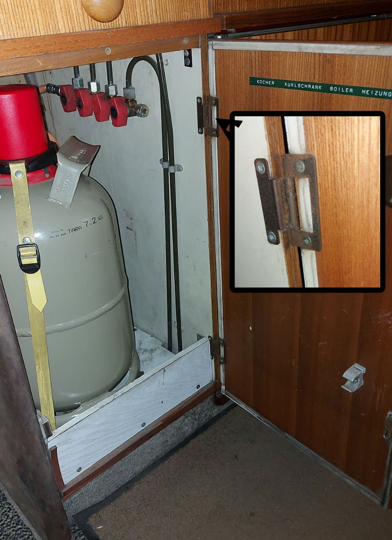 Wie man sieht, ist die Dichtung in die Tür (auch unter den Scharnieren) geklebt. Das untere Brett wurde damals von mir eingebaut, da ich anstelle einer 11kg-Flasche lieber 2x5kg nutzen wollte. Dadurch musste ich den Boden für die zweite Flasche etwas höher setzen und habe zur Trennung dann unten das Brett eingesetzt  und ebenfalls mit einer Dichtung versehen. So steht es auch in meinem Prüfbuch.
