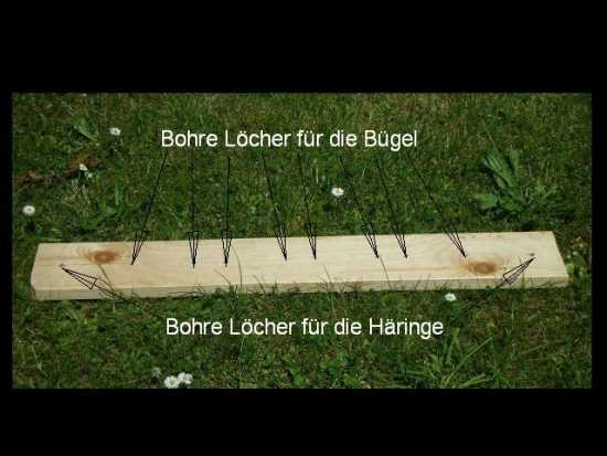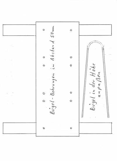 Die Bügel können auch aus Holz oder Plastik hergestellt werden und mit Holzdübeln in die Bohrungen gesetzt werden. Die Konstruktion soll zerlegbar für den Transport ausgeführt werden.