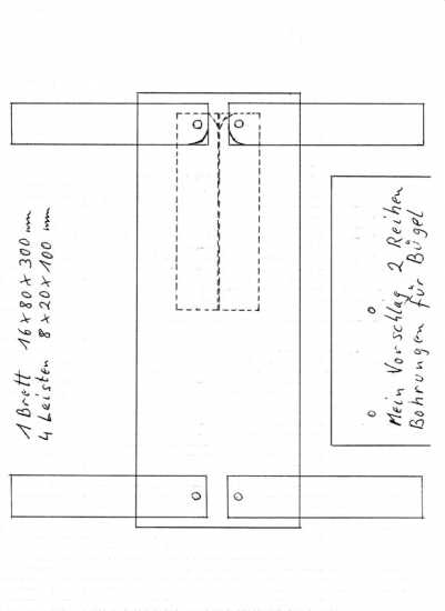 Je nach Bügelanzahl und Einteilung der Stückzahl kann die Brett-Länge ausgerechnet werden. Mein Vorschlag zwei Reihen Bohrungen auf der schmalen Seite des Brettes.