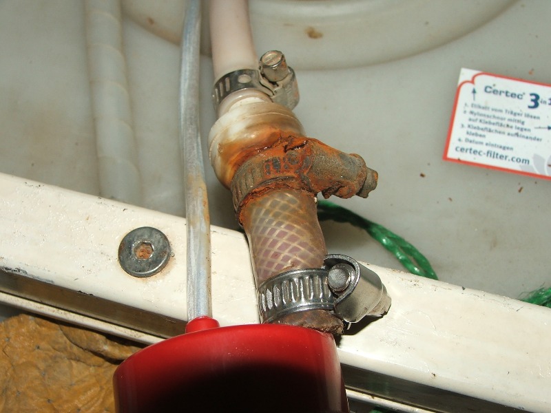 Ich habe übrigens noch einen Tipp für alle Besitzer von Tauchpumpen im Frischwassertank: Bei den Schlauchschellen unbedingt darauf achten, dass sie der Qualität W5 entsprechen. Andernfalls sehen sie nach kurzer Zeit so aus: