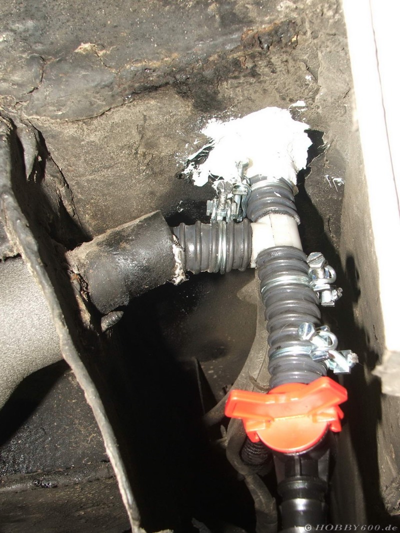 T-Stück und Abwasserschlauch sind zusätzlich noch mit Kautschuk isoliert.