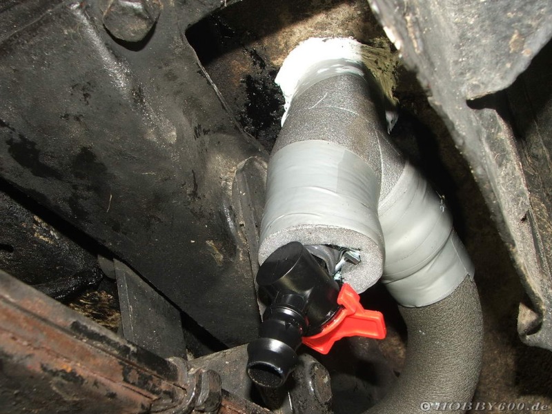 Ich habe zunächst alle Abwasserschläuche erneuert, das die alten nach 32 Jahren knüppelhart waren. Dort, wo die Schläuche aus dem Boden kommen ist nun ein T-Stück verbaut. Nach unten hin befindet sich ein Absperrhahn. Ist er geöffnet, fließt das Abwasser direkt raus (in eine Eimer) und kann nicht einfrieren. Bei geschlossenem Hahn fließt das Abwasser durch die seitliche Öffnung wie gehabt in den Abwassertank.