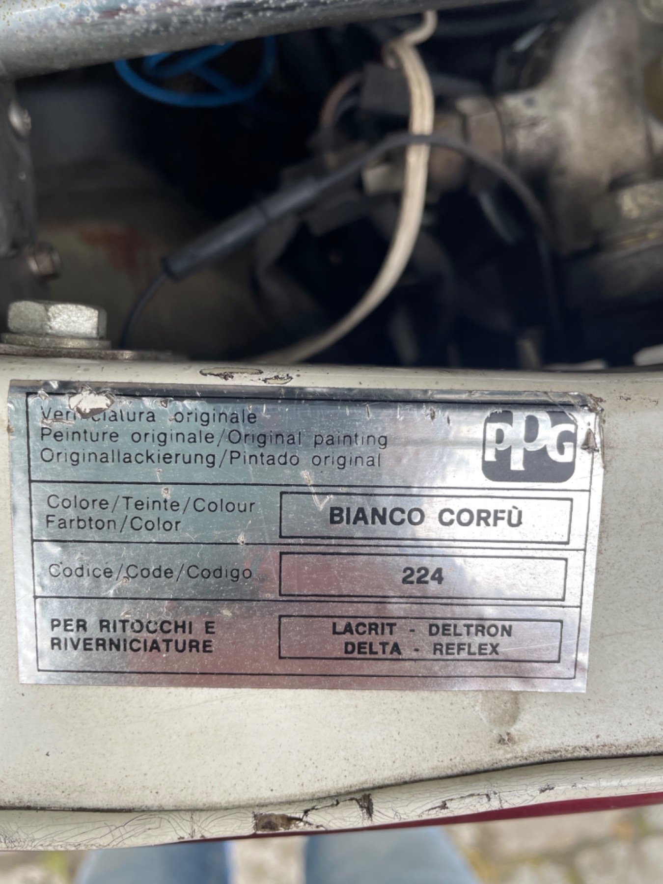 ich habe eine Frage. Ich möchte bei meinem Hobby etwas lackieren, habe aber keine Ahnung, welcher Farbton-/töne gemeint sind. Siehe Titelbild. Im Motorraum steht BIANCO CORFÜ und der Code 224.