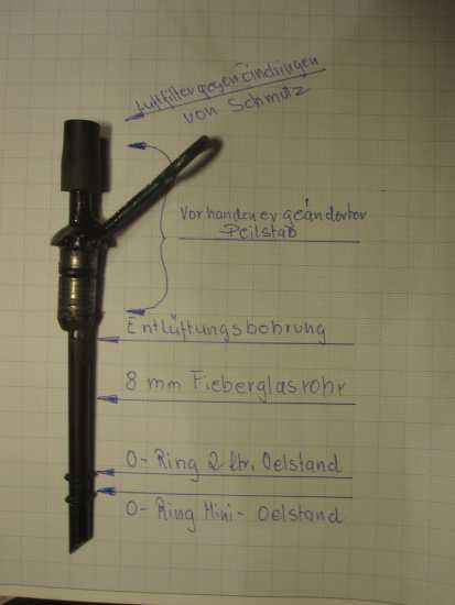 Da alle neuen Getriebe eine Entlüftung haben und mir der Umbau zuviel Arbeit war kam ich ebenfalls auf die Idee den Peilstab zu ändern mein erster Versuch sieht so aus.