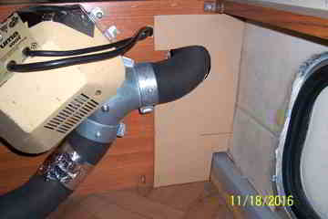 Zu viele Bogen bremsen den Luftstrom, deshalb habe ich das Gebläse um 45 Grad im Gegenuhrzeigersinn versetzt. Nun komme ich ohne grossen Bogen ziemlich direkt in den Luftschlauch der nach dem vorderen Ausströmer am Kühlschrank geht.