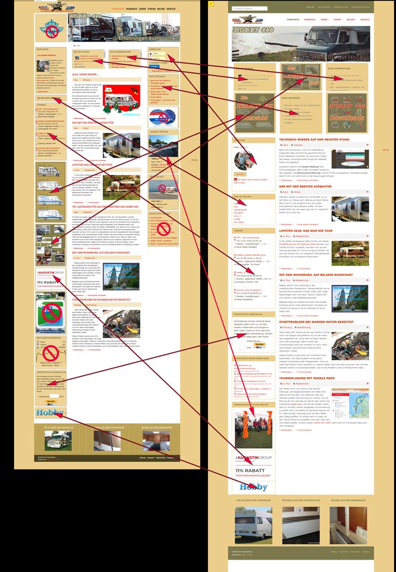 Hier mal ein Vergleich der alten und neuen Startseite. Man sieht an den Pfeilen, welche Module von wo nach wo gewandert sind, welch weggefallen sind und wie gesagt: Downloads ist neu.