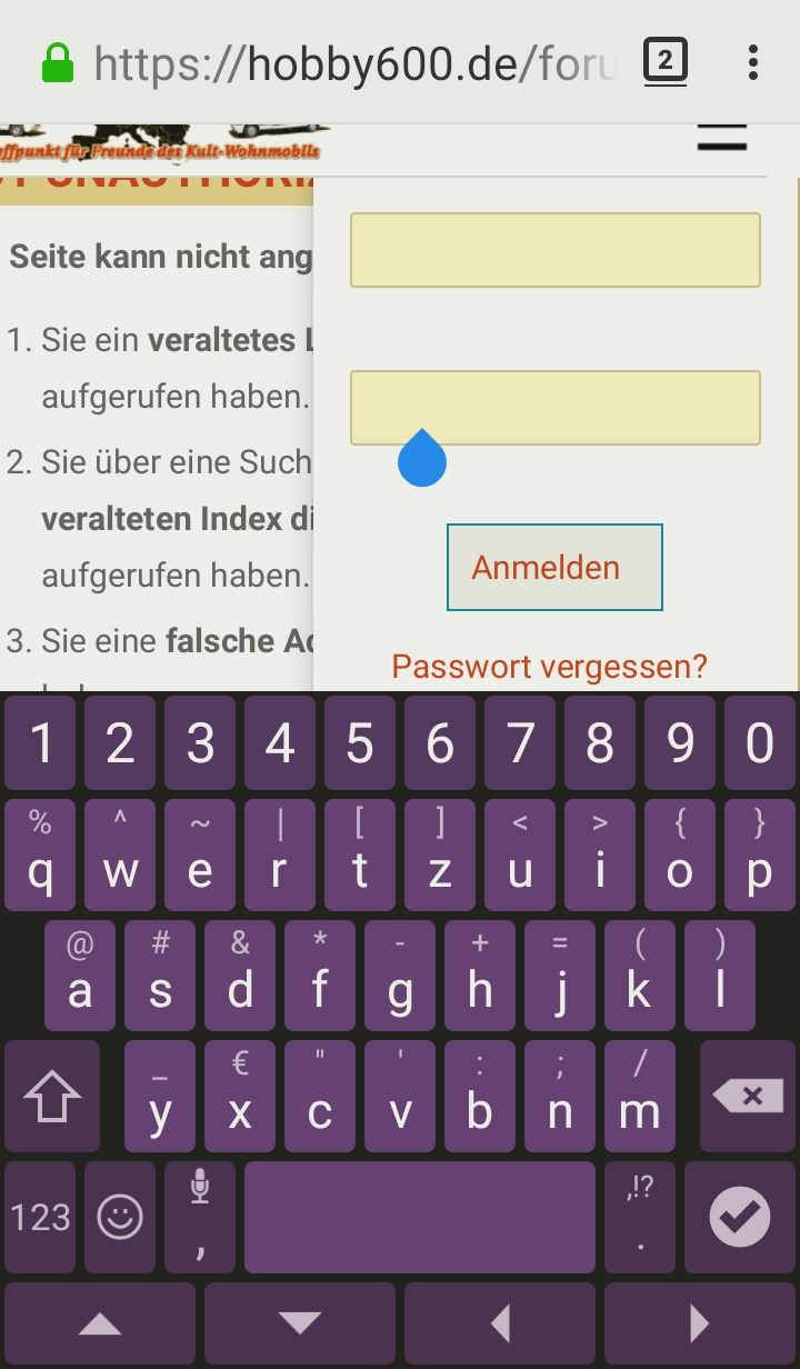 Hallo Wilfried, seit einiger Zeit habe ich ein kurioses "Problem". Wenn ich mich, egal ob auf dem Smartphone oder auf dem Laptop, einloggen möchte, dann erscheint zwar das Fenster mit den 2 Zeilen zum Einloggen, ich kann aber nichts reinschreiben. Es reicht, wenn ich auf "Anmelden" tippe, dann bin ich auch schon eingeloggt, ohne das ich meinen Namen oder Paßwort eingeben konnte bzw. mußte. Ich hänge das Beispielfoto an.