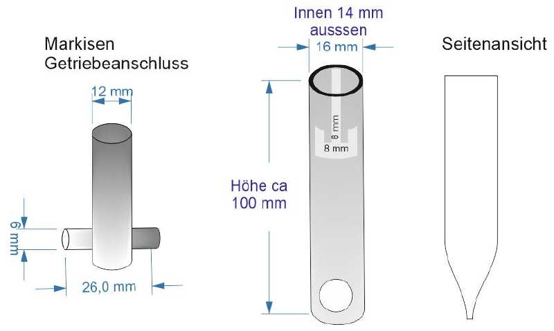Da sich der Alugußkopf der Kurbel unserer Omnistor 4000 verabschiedet hatte und bekanntlich keine Ersatzteile für die Markise mehr lieferbar sind, habe ich mir folgende Lösung mit einem ortsansässigen Metallbauer gebastelt.