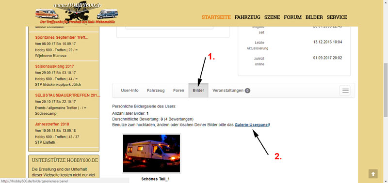Hallo, zunächst ruftst Du Dein Profil auf und klickst auf <Bilder>. Dort siehst Du den Hinweis auf das <Galerie-Userpanel>. Da klickst Du drauf und siehst dann eine Übersicht Deiner Bilder (Bild 1).