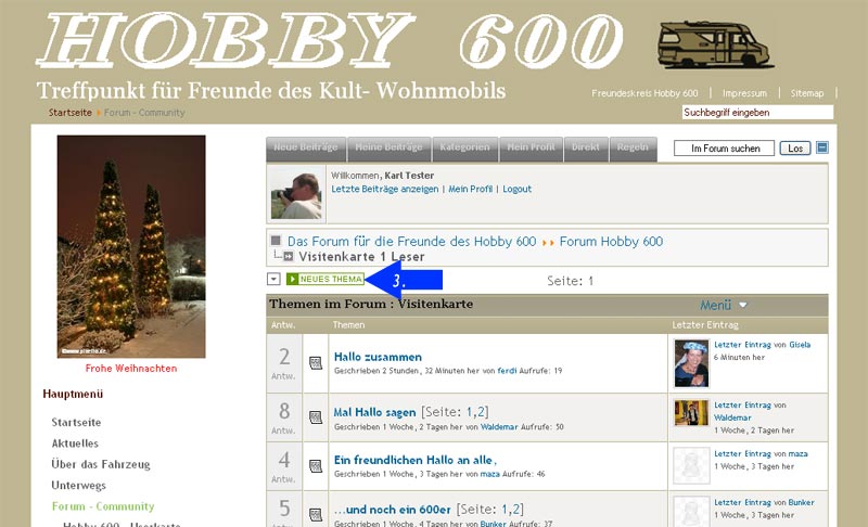Nun klickst Du im Menü auf „Forum" (Bild 3.1) und gelangst im Forum zur Kategorie-Übersicht. Hier wählst Du nun die für Deinen Beitrag in Frage kommende Kategorie aus; ich wähle in diesem Beispiel die Visitenkarte (Bild 3.2). Dort findest Du ganz oben einen grünen Button „Neuer Beitrag" (Bild 4.3). Wenn Du darauf klickst, öffnet sich ein neues Fenster mit dem Eingabeformular.
