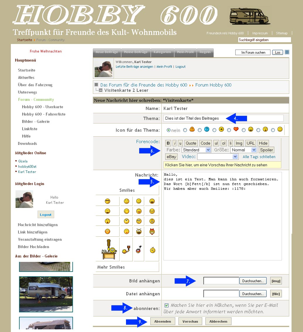 Hier schreibst Du in das Eingabefeld „Thema" die Überschrift bzw. den Titel Deines Beitrages (Bild 5.4). Der eigentliche Text kommt nun in das Feld Nachricht (Bild 5.5). Mit Hilfe des Forencode (Boild 5.6) kannst Du ein paar Formatierungen an Deinem Text vornehmen. Ebenso kannst Du Smilies auswählen und in den Text einfügen oder ein Bild von Deinem lokalen Rechner auswählen, Hochladen und in Deinen Beitrag einfügen (Bild 5.7). Die Größe der Bilder ist aber auf 800 Pixel (Breite oder Höhe) und Dateigröße auf 200 Kilobyte begrenzt. Natürlich lassen sich auch Dateien in bestimmten Formaten anhängen. Dabei bitte, ebenso wie bei Bildern, die Urheberrechte beachten!