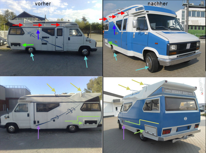 Vor knapp drei Wochen habe ich hier auf eine Auktion bei ebay aufmerksam gemacht. Unter dem Titel Wohnmobil Hobby 600 Kultfahrzeug aktuell bei ebay berichtete ich über einen besonders hartnäckigen Verkäufer, der seinen mangelbehafteten Hobby 600 unbedingt mit unserer Webseite bewerben wollte. Das Fahrzeug ging dann doch für 2200 € Sofortkauf weg.... und taucht jetzt wieder mit dem Titel Ein TOP ANGEBOT !! HOBBY 600 KOMPLETT RESTm.TÜV / AU bei ebay auf.....äußerlich leicht verändert, aber schaut Euch mal die Details an. Ich habe sie mit farbigen Pfeilen markiert.