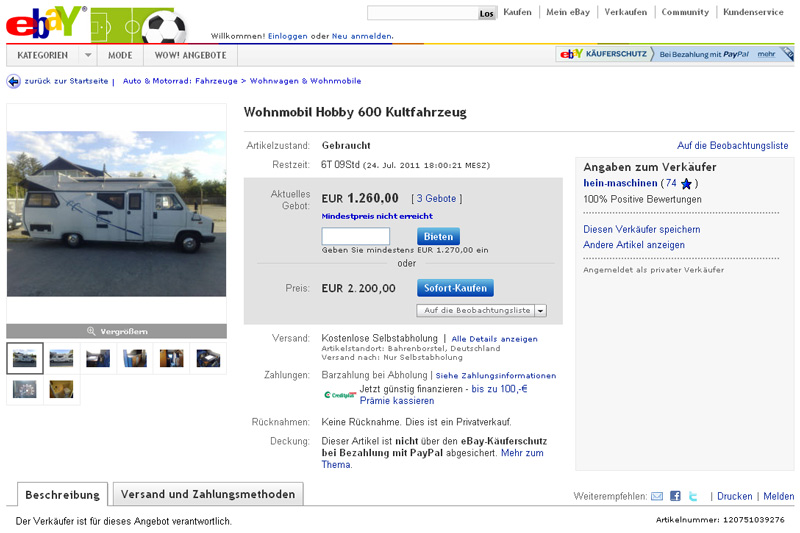 Aktuell läuft wieder ein besonders hartnäckiges Angebot bei ebay: Wohnmobil Hobby 600 Kultfahrzeug. Bereits im Mai 2011 hatte ich den Verkäufer aufgefordert, den Hinweis auf Hobby600.de aus seinem Angebot zu entfernen.