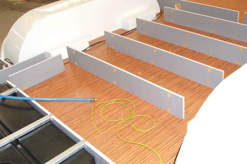Wir konnten das Bekleben des Doppelbodens eines Toskana-Modells mit PVC-Belag sehen. Ebenso das Bearbeiten der Verbindungsleisten und Ausschnitte für die späteren Einbauten mit einer CNC- Fräsmaschine. Hier durfte ich dann auch ein paar Fotos der Bauteile machen – das Fotografieren von Mitarbeitern ist nicht gestattet. Hier stehen auch vorbereitete Seitenwände für die Sphinx- Modellreihe und die dem Hobby 600 sehr ähnlichen, weil gewölbten Seitenwände des Van Exclusive.