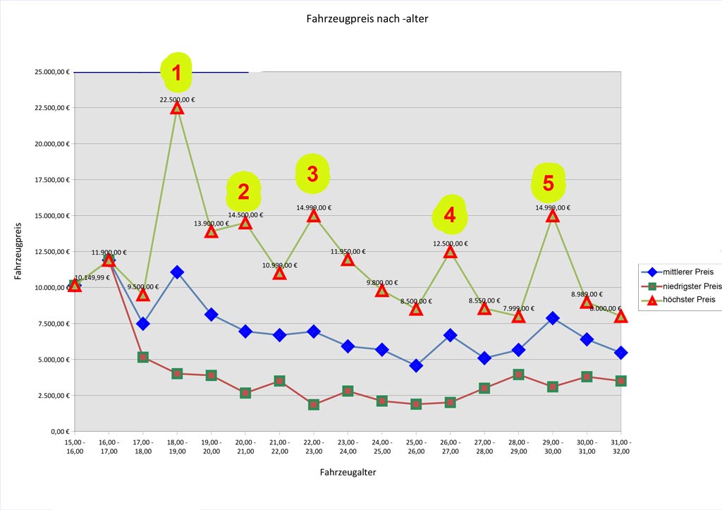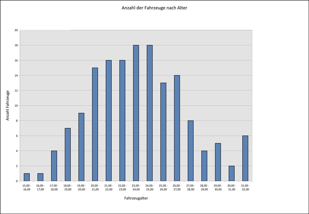 Basierend auf den eingegebenen Daten habe ich auch schon einige Abfragen erstellt. Für die Statistik ist die „Anzahl der Fahrzeuge nach Alter“. Interessanter sind dann schon die Darstellungen „Preis nach Alter“ und „Preisentwicklung im Lauf der Jahre“. Bevor ich diese Kurven erläutere, zunächst ein paar Anmerkungen zu den verwendeten Daten.