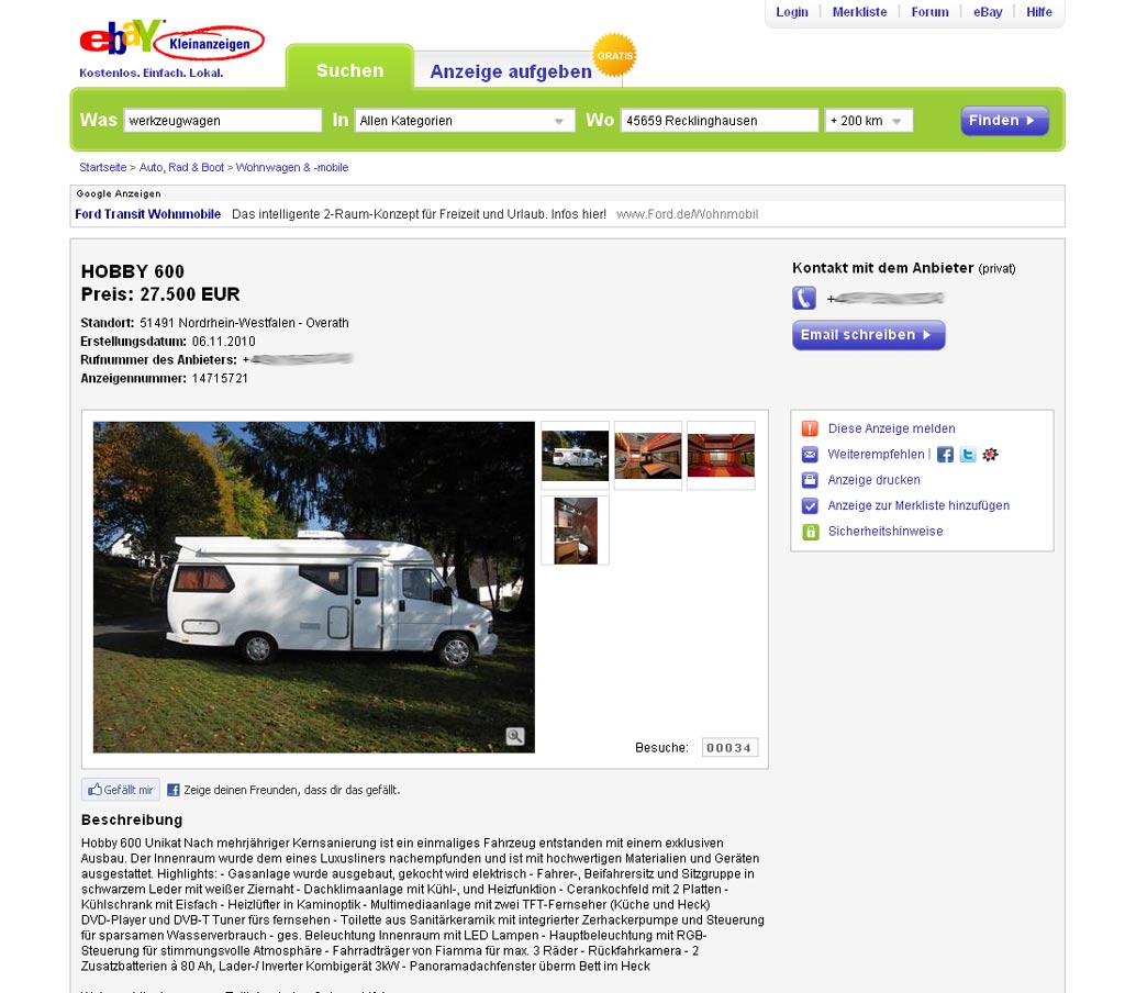 Das Fahrzeug wurde zuletzt für 14.500 € angeboten. Ob und für wieviel es wohin verkauft wurde, kann ich nichtsagen. Ich habe diesen auffälligen Hobby 600 mit den rechteckigen Fenstern auch nie wieder gesehen. Auch hier sind sowohl Fahrzeug als auch geforderter Preis nicht typisch und ich habe dieses Inserat ID170 auf nicht relevant gesetzt.