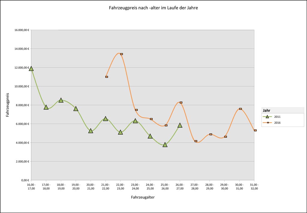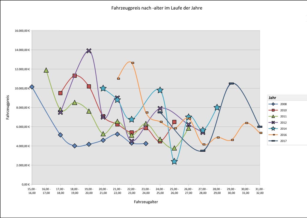 In einer anderen Abfrage habe ich einmal die Entwicklung der Fahrzeugpreise nach dem –alter im Laufe der Jahre