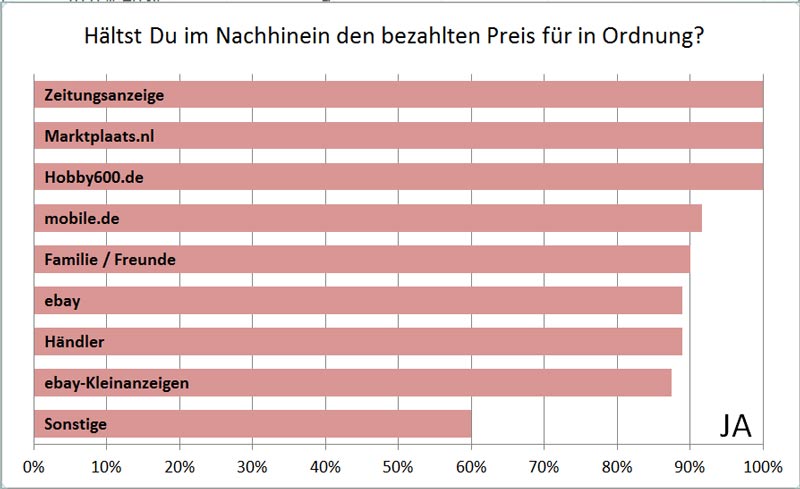 Bei den Internet-Angeboten habe ich natürlich nicht an die ausländischen Portale gedacht. Da aber z.B. Marktplaats.nl und ebay-Kleinanzeigen vom Prinzip her nicht unterscheiden, denke ich die Ergebnisse sind vergleichbar. Es ging mir bei der Umfrage ja in erster Linie um die Frage: Um wieviel wurde der im Inserat geforderte Preis heruntergehandelt?