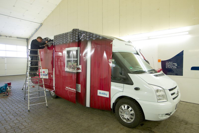 Dass der als Schwedenhaus „getarnte“ Hobby Siesta überall auf seiner Tour für viel Aufmerksamkeit sorgte, ist das Resultat einer perfekten Beklebung mit Spezialfolien.