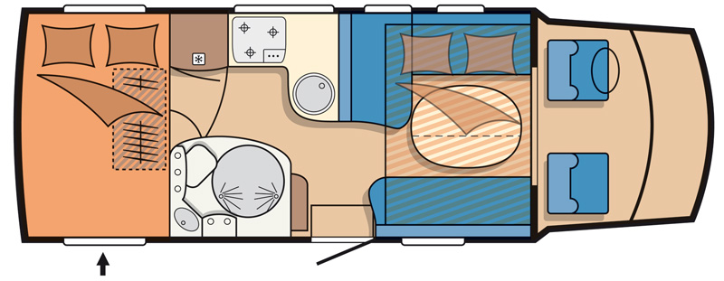 Mit dem Teilintegrierten D 690 H GFLC der Baureihe Toskana Exclusive präsentiert Hobby sein erstes Reisemobil mit einem Hubbett. Das große H in der Typenbezeichnung des neuen Toskana Exclusive D 690 H GFLC steht für Hubbett. Das befindet sich im vorderen Bereich des Reisemobils über der gemütlichen L-Sitzgruppe. Wird das Bett nicht benötigt, verschwindet es raumsparend unter der „Zimmerdecke“, ohne die Bewegungsfreiheit im Bereich der Wohngruppe einzuschränken.