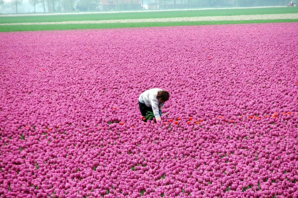 Man bekommt während der Tour aber auch einiges von der Arbeit, die in der Tulpenzucht steckt, mit. Teilweise werden Maschinen eingesetzt. Zum (aus-)sortieren werden aber Menschen benötigt. Und so sieht man immer wieder Menschen, die z.B. die roten Tulpen aus dem lila Feld entfernen.