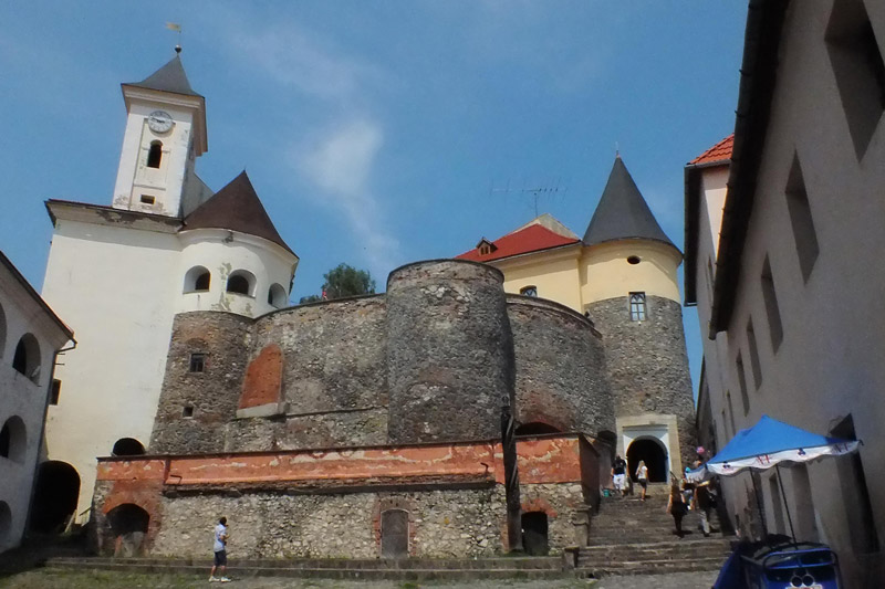 Valerij treibt zur Eile an. Er will heute noch über die Karpaten nach Lemberg. Vorher wollen wir aber noch die Burg Palanok in Mukatschewe besichtigen. Wir fahren den kleinen Hügel hoch. Die Auffahrt war steil und im Burghof ist es eng. Valerij muss im engen Burghof umdrehen, dann kommt auch noch Gegenverkehr. Nach heftiger Diskussion sieht der andere Fahrer ein, dass Valerijs Wagen rückwärts zu schwer ist. Er lässt sein Auto nur 25 m (!) zurück in eine freie Parkbucht rollen. Ich gleich hinterher, nicht dass noch einer kommt. In einer Aussprache wäre ich der Verlierer.