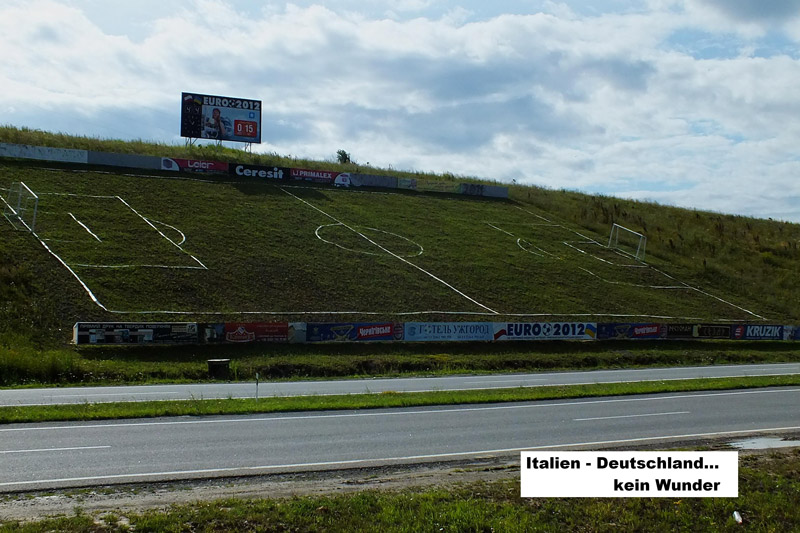 Wir fahren weiter nach Lemberg. Nach rund 280 km haben wir unser Tagesziel erreicht. Die erste Nacht in der Ukraine schlafen wir auf dem Hippodrom mit Hotel gegenüber dem EM- Stadion. Es kostet 200 Hrywnja pro Auto. Anscheinend haben die hier noch nicht bemerkt, dass die EM vorbei ist. Wir sind auf dem Platz alleine. Aber er ist bewacht und sicher. Die Toiletten mit Dusche sind neu und sehr sauber.