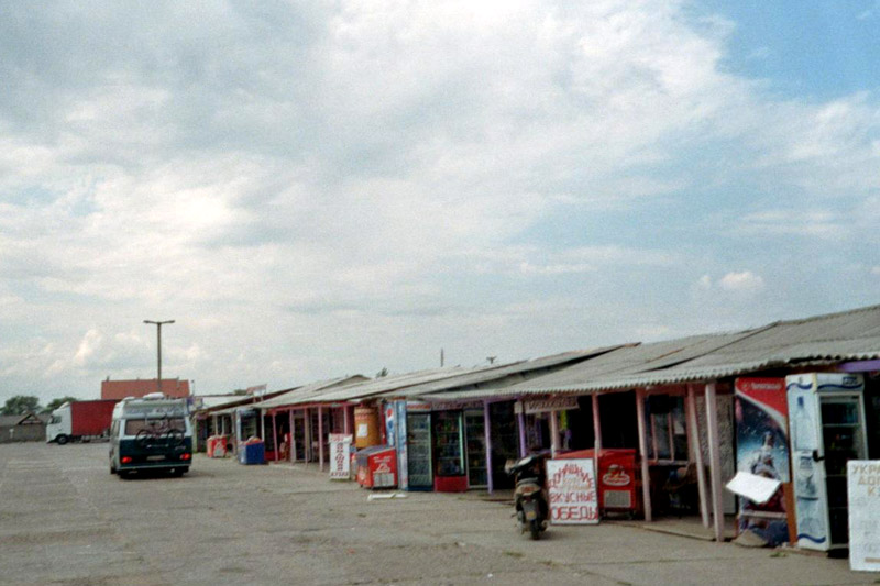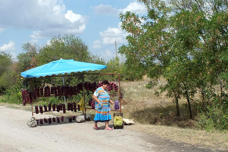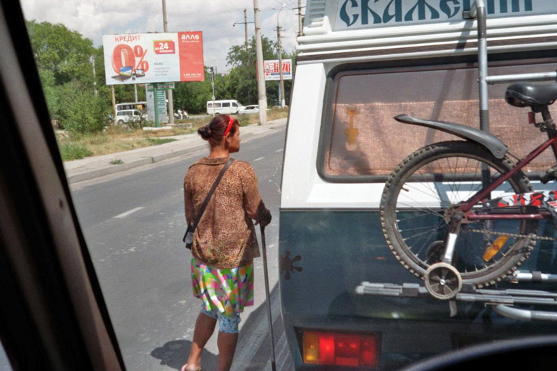 Die Krimberge werden kleiner, die Krimsteppe beginnt wieder. Es ist wie bei der Anreise eine eintönige Reise. Eine Abwechslung bietet nur Simferopol. Hier hätten wir nicht den Umgehungsschildern folgen sollen. Valerij ist der Meinung, durch die Stadt wäre die Straße besser gewesen. Er fährt hier nie wieder. Die Bettelei hält sich eigentlich in Grenzen, vielleicht weil wir zu viel gefahren sind. Das kleine Rohr vor den Hütten ist die Gasleitung, sie ist im ländlichen überall so verlegt.