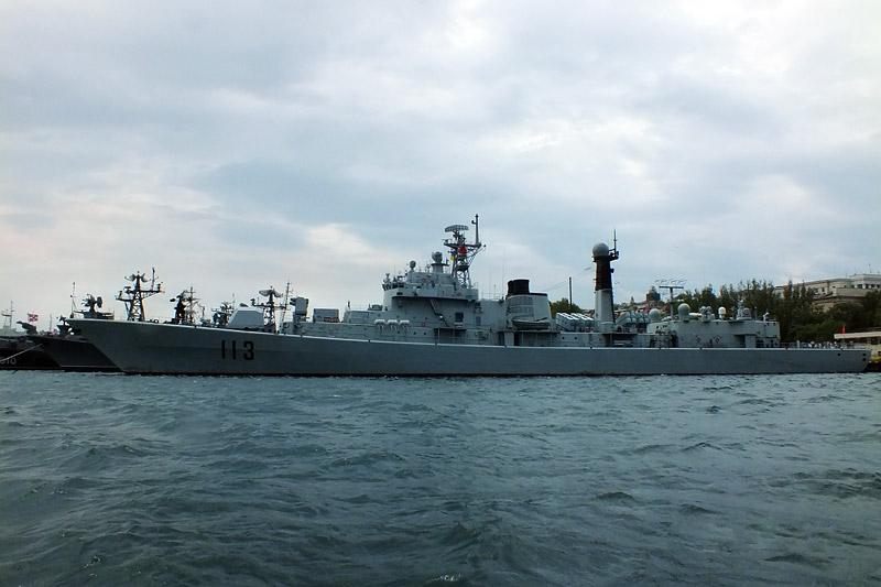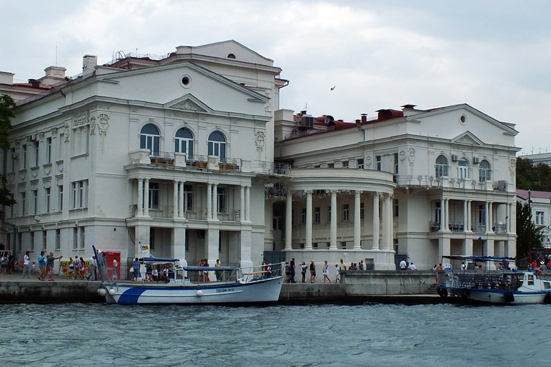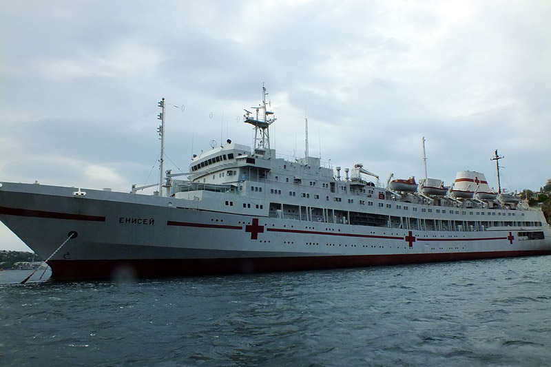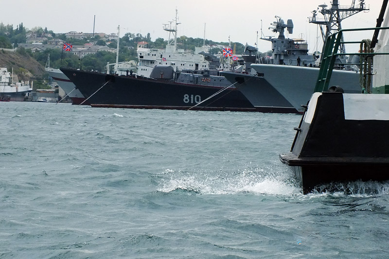 Wir starten und es beginnt stark zu regnen. Eigentlich bei der Hitze eine willkommene Wohltat. Der Wind frischt auf und der Wellengang ist für dieses Boot erheblich. Jetzt müssen wir hier durch, meint er zu Swetlana. Sie ist kreidebleich, aber tapfer. Hier war früher absolutes Sperrgebiet. Unser Skipper zeigt uns viele Schiffe der Schwarzmeerflotte. Zum Teil sehr verbeult und verrostet; Hauptsache, sie schwimmen noch. Dann das Flagschiff. Kaum zu glauben, dass so ein paar Rohre eine solche Bedrohung bedeuteten. Von einem Hospitalschiff erzählt uns der Skipper, dass die Operationstische auf Öl liegen. Das soll bei Wellengang saubere Schnitte ermöglichen. Welch eine Beruhigung. Natürlich führt uns unsere Rundfahrt auch durch den ukrainischen Teil , der bei Bedarf mit Netzen verschlossen werden kann. Unterwegs gesteht Swetlana meiner Frau, dass sie schlecht schwimmen könne. Seekrank? Swetlana …. Nein. Kaum an Land, wird sie wieder frech.