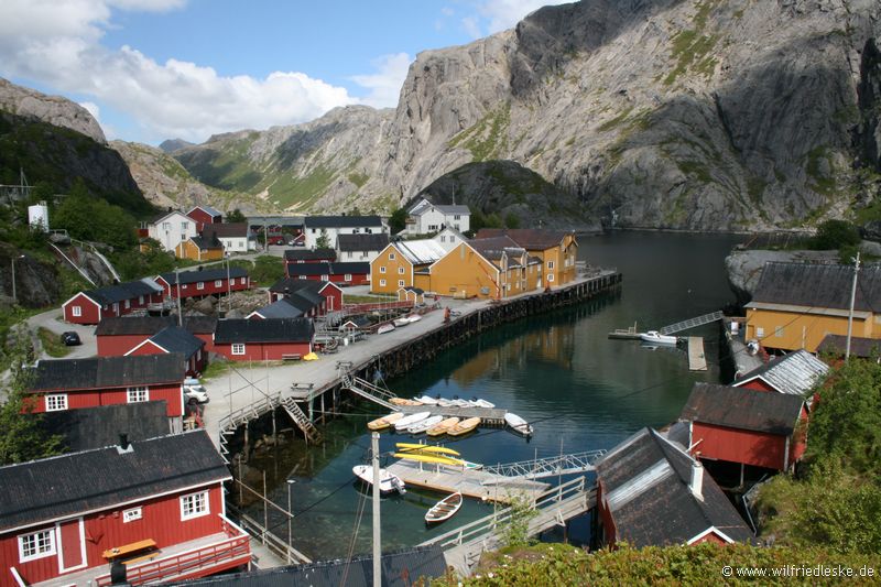 Dieser Ort liegt bereits auf der Insel Flakstad und ist von der UNESCO als Weltkulturerbe deklariert. Der kleine Fischerort Nusfjord hatte den Vorteil eines optimal windgeschützten Hafens, in dem wegen seiner Größe aber nur wenige Boote Platz fanden. Heute sind es nur die Touristen, die das Bild in dem Ort beherrschen. Die Rorbuers sind zu einer Hotelanlage umgebaut und das Zimmermädchen fährt mit dem Bollerwagen von Hütte zu Hütte und bezieht die Betten. Das Ganze passiert auf Stegen, die eigentlich im Wasser stehen, so wie auch die Hütten „irgendwie" an den Felsen geklatscht sind. Der größte Teil steht auf Stelzen im Wasser.