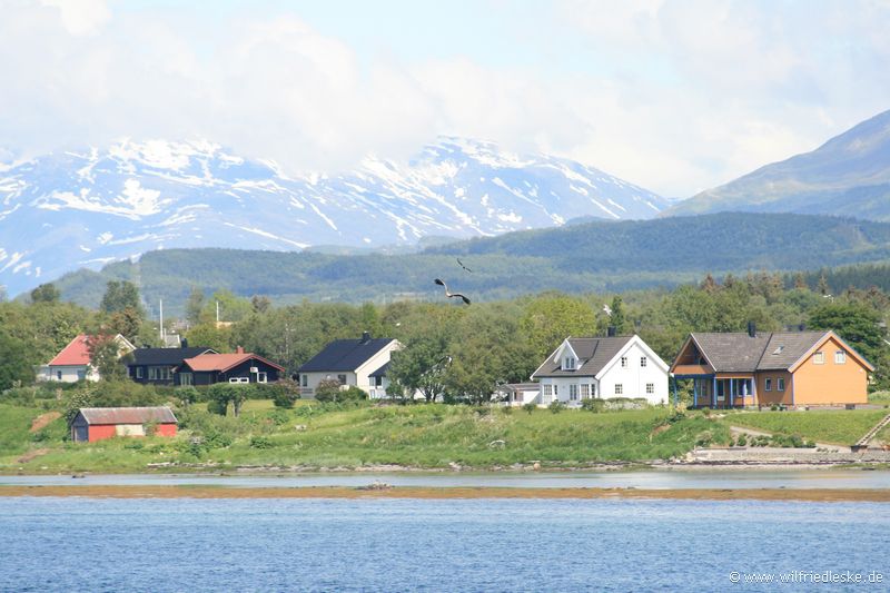Mosjøen zufahren. Die Fahrt dorthin bescherte uns bei herzlichstem Wetter noch einmal traumhafte Blicke über den Vefsnfjorden. Sehenswert ist auch die Altstadt von Mosjøen. Hier stehen rund 100 gut erhaltene Holzhäuser aus dem 19. Jahrhundert, incl. einer sehenswerten alten Tankstelle.