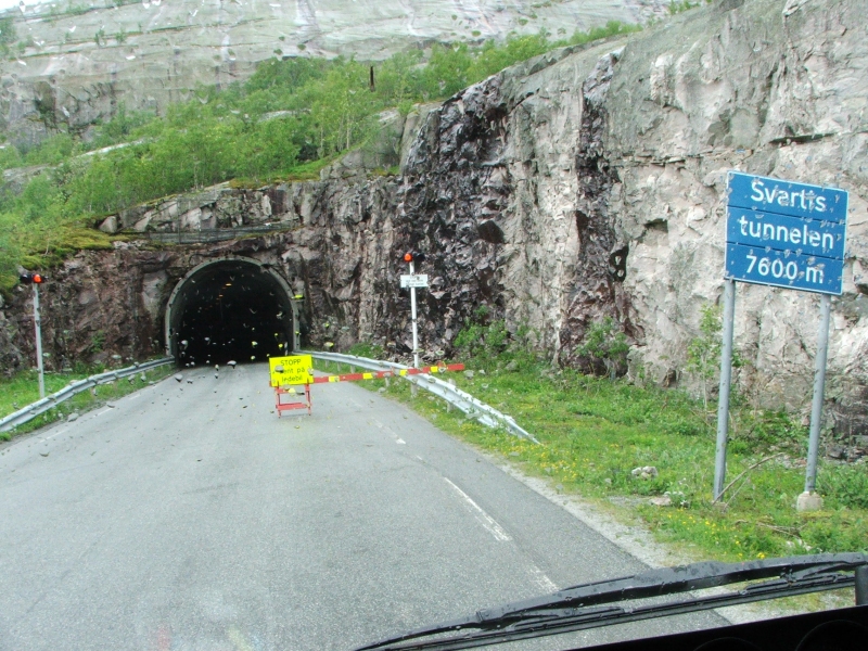 Die Straße folgt der Küstenlinie entlang des Glomfjord zur gleichnamigen Ortschaft. Diese liegt leider etwas höher am Berg, sodass wir sie glatt Unterfuhren. Vielleicht waren wir auch zu sehr von den Kraftwerksgebäuden abgelenkt. Auf jeden Fall waren wir auf einmal in einem Tunnel, fuhren in ihm ständig bergauf und als wir ihn verließen befanden wir uns an einem kleinen See mitten in den Bergen. Vor uns lag der Svartisgletscher, der zweitgrößte Gletscher Norwegens. Im Moment bekamen wir davon allerdings nicht viel mit. Unsere Straße sollte uns nämlich auf einer Länge von 7600 m unter den Berg herführen. Dabei kam mal wieder eine norwegische Besonderheit zu tragen. Im Tunnel befand sich eine Baustelle, sodass der Tunnel nur mit Führungsfahrzeug zu befahren war. So durften wir zunächst am Tunneleingang warten, bis das „SafetyCar" eine Kolonne aus dem Tunnel geführt hatte, drehte und sich dann vor unser Fahrzeug stellte. Mit eingeschalteten Blinklichtern fuhr es dann vor uns her und bestimmte das Tempo bzw. zeigte uns die zu wählende Fahrspur, wie in der Formel 1. Diese Art der Baustellendurchquerung trafen wir in Nordnorwegen mehrmals an. Wäre bei unserem Verkehrsaufkommen undenkbar, hier aber ein profanes Mittel der Baustellenabsicherung.